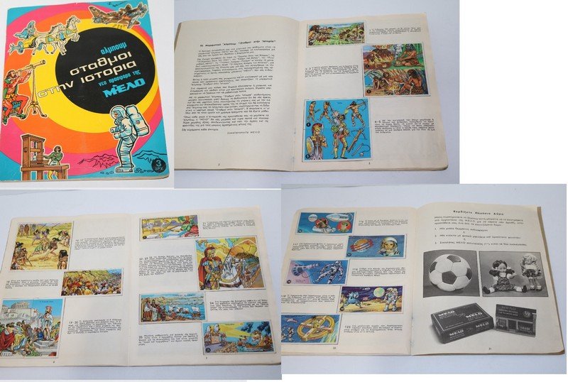 Συλλεκτικό άλμπουμ Σταθμοί στην Ιστορία – Μέλο, με 119 χαρτάκια, από τα οποία λείπει μόνο το 14. Μια μοναδική συλλογή που συνδυάζει ιστορική γνώση με διασκέδαση, ιδανική για συλλέκτες και παιδιά που θέλουν να εξερευνήσουν την ιστορία μέσα από εικόνες και αυτοκόλλητα.